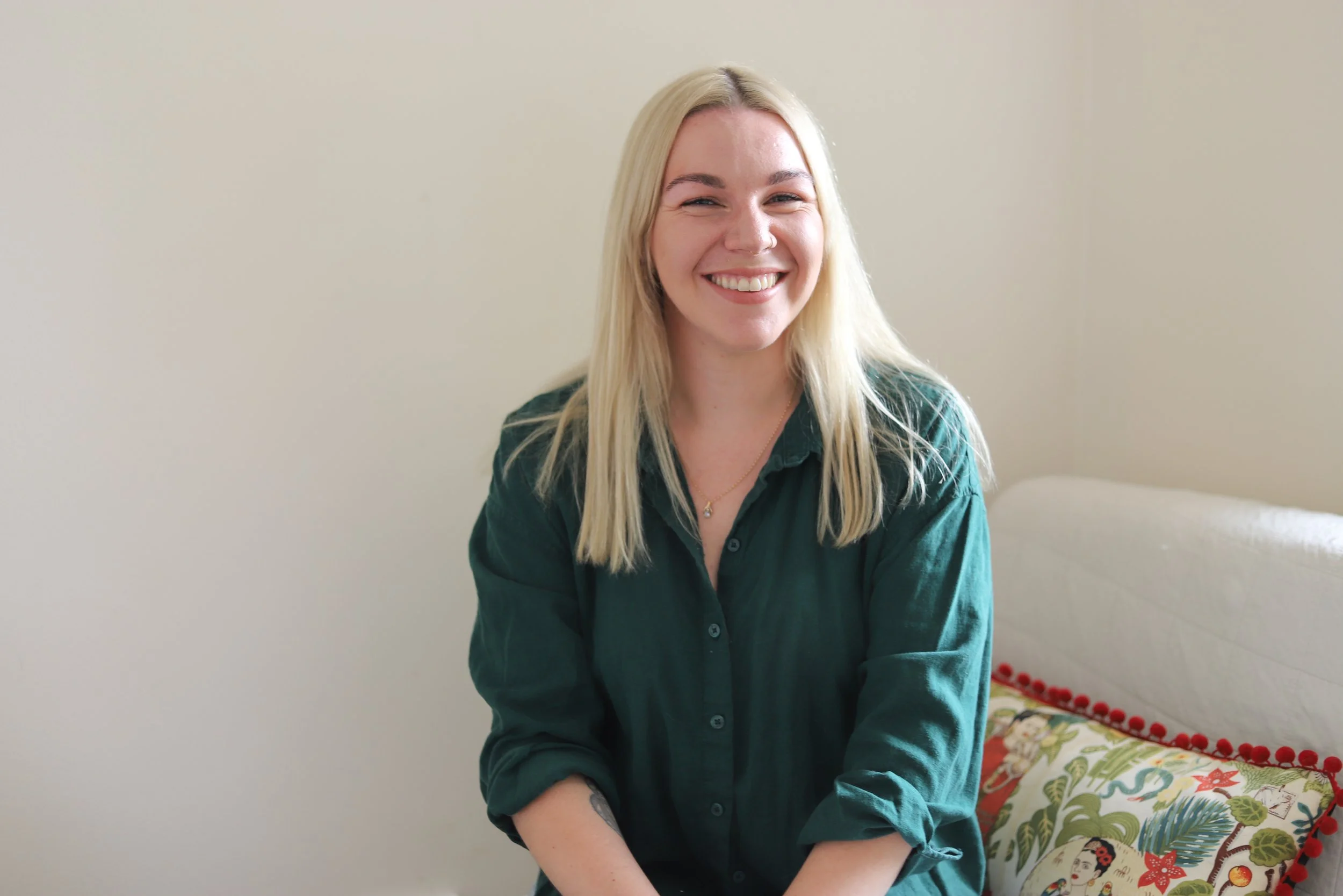 A woman with blonde hair smiling while sitting on a white couch with a colorful cushion, against a plain beige wall.
